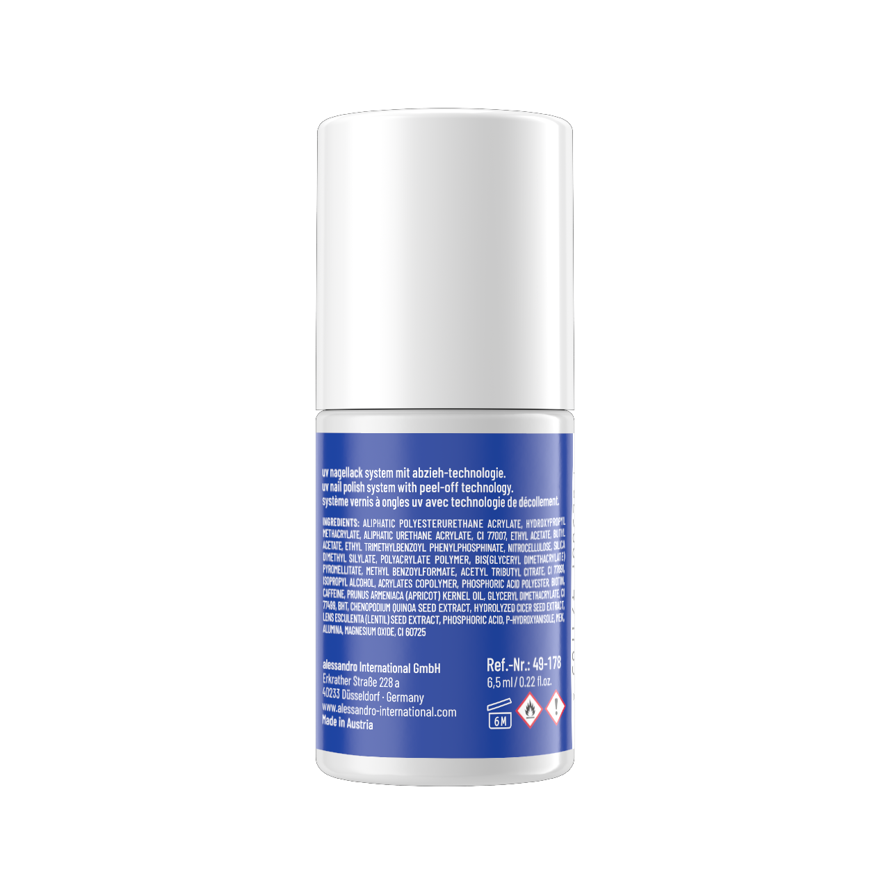 Alifatyczny poliuretan akrylanowy, Hydroksypropylometakrylan, Alifatyczny akrylan uretanowy, CI 77007 (błękit pruski), Octan etylu, Octan butylu, Etylotrimetylo-benzoylofenylfosfinian, Nitroceluloza, Silika dimetylosililowana, Polimer poliakrylanowy, Bis(glicerylo-dimetakrylan) piromelitat, Benzoiloformat metylu, Cytrynian acetylotributylu, CI 77891 (dwutlenek tytanu), Alkohol izopropylowy, Kopolimer akrylanów, Poliester kwasu fosforowego, Biotyna, Kofeina, Olej z pestek moreli (Prunus Armeniaca), Glicerylodimetakrylan, CI 77499 (czarny tlenek żelaza), BHT (butylohydroksytoluen), Ekstrakt z nasion komosy ryżowej (Chenopodium Quinoa), Hydrolizowany ekstrakt z nasion ciecierzycy, Ekstrakt z nasion soczewicy (Lens Esculenta), Kwas fosforowy, P-hydroksyanizol, MEK (metyloetyloketon), Tlenek glinu (Alumina), Tlenek magnezu, CI 60725 (fioletowy barwnik).