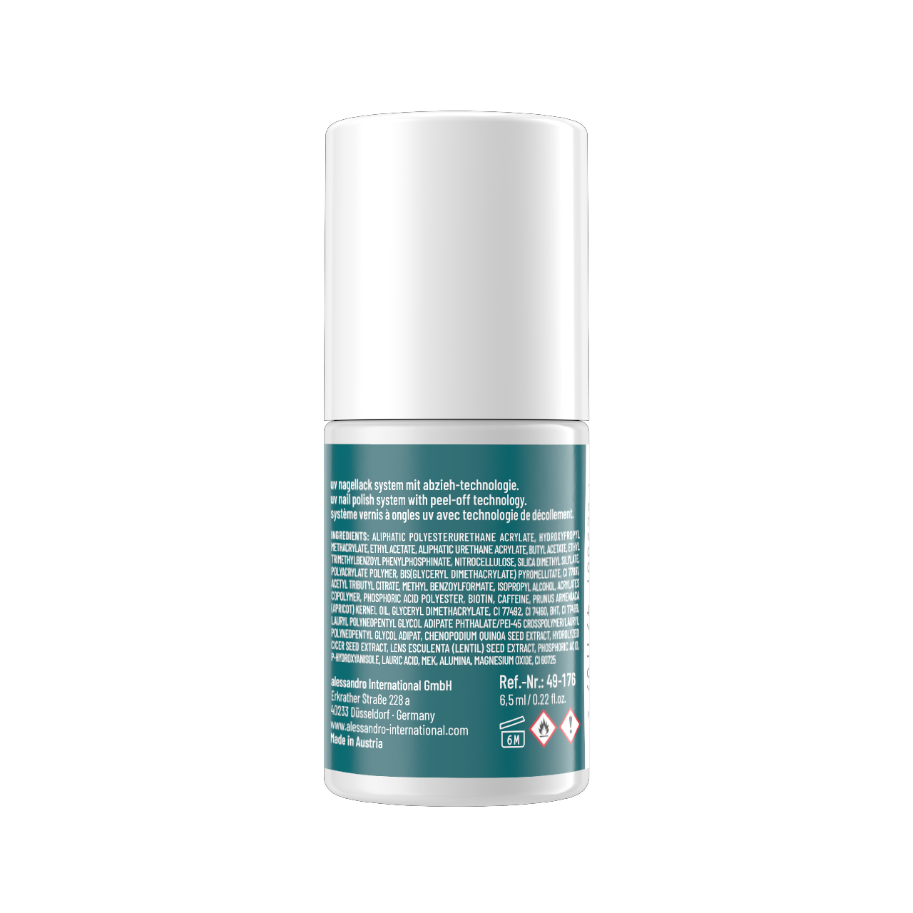 Alifatyczny poliuretan akrylanowy, Hydroksypropylometakrylan, Octan etylu, Alifatyczny akrylan uretanowy, Octan butylu, Etylotrimetylo-benzoylofenylfosfinian, Nitroceluloza, Silika dimetylosililowana, Polimer poliakrylanowy, Bis(glicerylo-dimetakrylan) piromelitat, CI 77891 (dwutlenek tytanu), Cytrynian acetylotributylu, Benzoiloformat metylu, Alkohol izopropylowy, Kopolimer akrylanów, Poliester kwasu fosforowego, Biotyna, Kofeina, Olej z pestek moreli (Prunus Armeniaca), Glicerylodimetakrylan, CI 77492 (żółty tlenek żelaza), CI 74160 (niebieski barwnik), BHT (butylohydroksytoluen), CI 77499 (czarny tlenek żelaza), Laurylowy poli(neopentylowy glikol) adypinian ftalan/PEI-45 kopolimer/Laurylowy poli(neopentylowy glikol) adypinian, Ekstrakt z nasion komosy ryżowej (Chenopodium Quinoa), Hydrolizowany ekstrakt z nasion ciecierzycy, Ekstrakt z nasion soczewicy (Lens Esculenta), Kwas fosforowy, P-hydroksyanizol, Kwas laurynowy, MEK (metyloetyloketon), Tlenek glinu (Alumina), Tlenek magnezu, CI 60725 (fioletowy barwnik).
