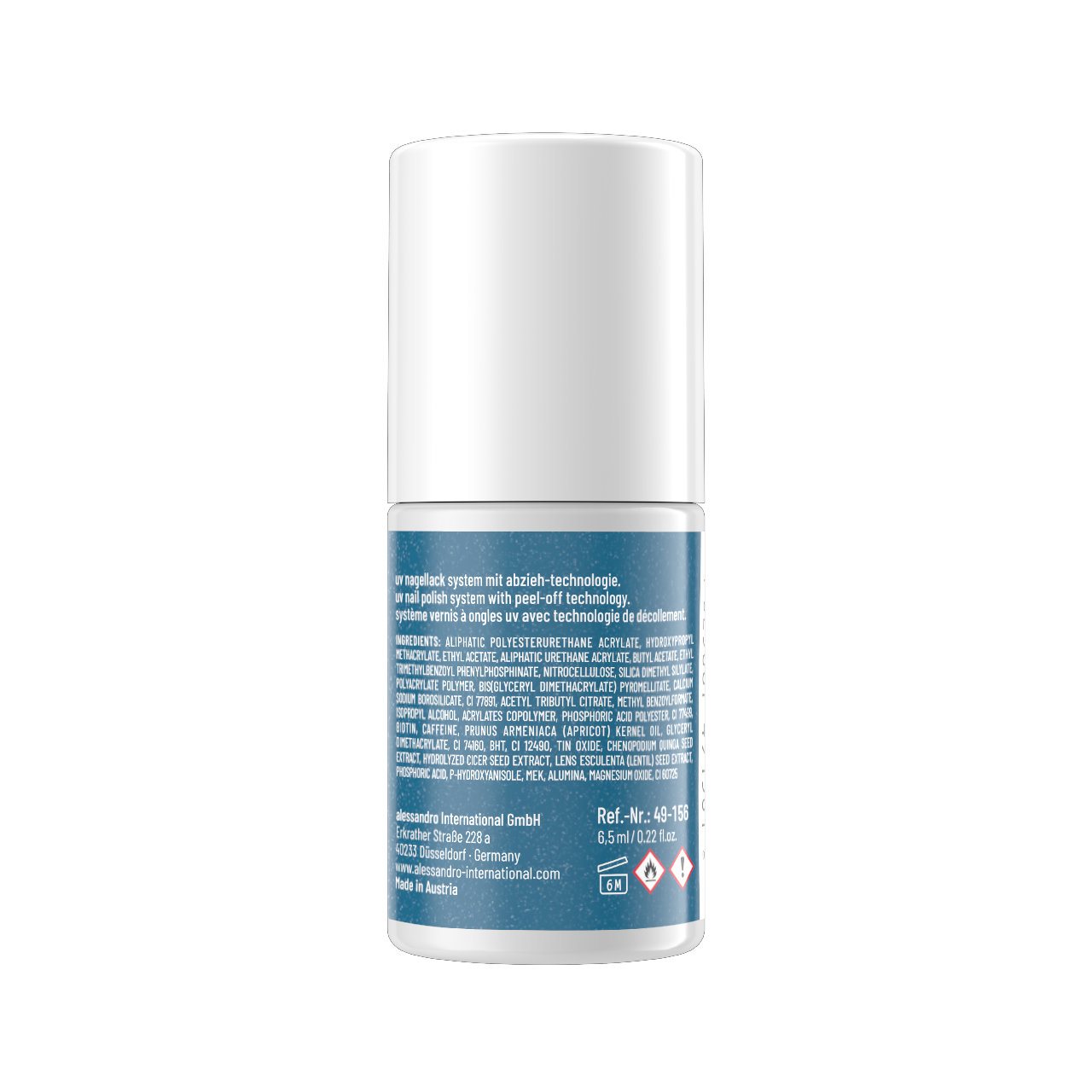 Alifatyczny poliuretan akrylanowy, Hydroksypropylometakrylan, Octan etylu, Alifatyczny akrylan uretanowy, Octan butylu, Etylotrimetylo-benzoylofenylfosfinian, Nitroceluloza, Silika dimetylosililowana, Polimer poliakrylanowy, Bis(glicerylo-dimetakrylan) piromelitat, Borokrzemian sodowo-wapniowy, CI 77891 (dwutlenek tytanu), Cytrynian acetylotributylu, Benzoiloformat metylu, Alkohol izopropylowy, Kopolimer akrylanów, Poliester kwasu fosforowego, CI 77499 (czarny tlenek żelaza), Biotyna, Kofeina, Olej z pestek moreli (Prunus Armeniaca), Glicerylodimetakrylan, CI 74160 (niebieski barwnik), BHT (butylohydroksytoluen), CI 12490 (czerwony barwnik), Tlenek cyny, Ekstrakt z nasion komosy ryżowej (Chenopodium Quinoa), Hydrolizowany ekstrakt z nasion ciecierzycy, Ekstrakt z nasion soczewicy (Lens Esculenta), Kwas fosforowy, P-hydroksyanizol, MEK (metyloetyloketon), Tlenek glinu (Alumina), Tlenek magnezu, CI 60725 (fioletowy barwnik).