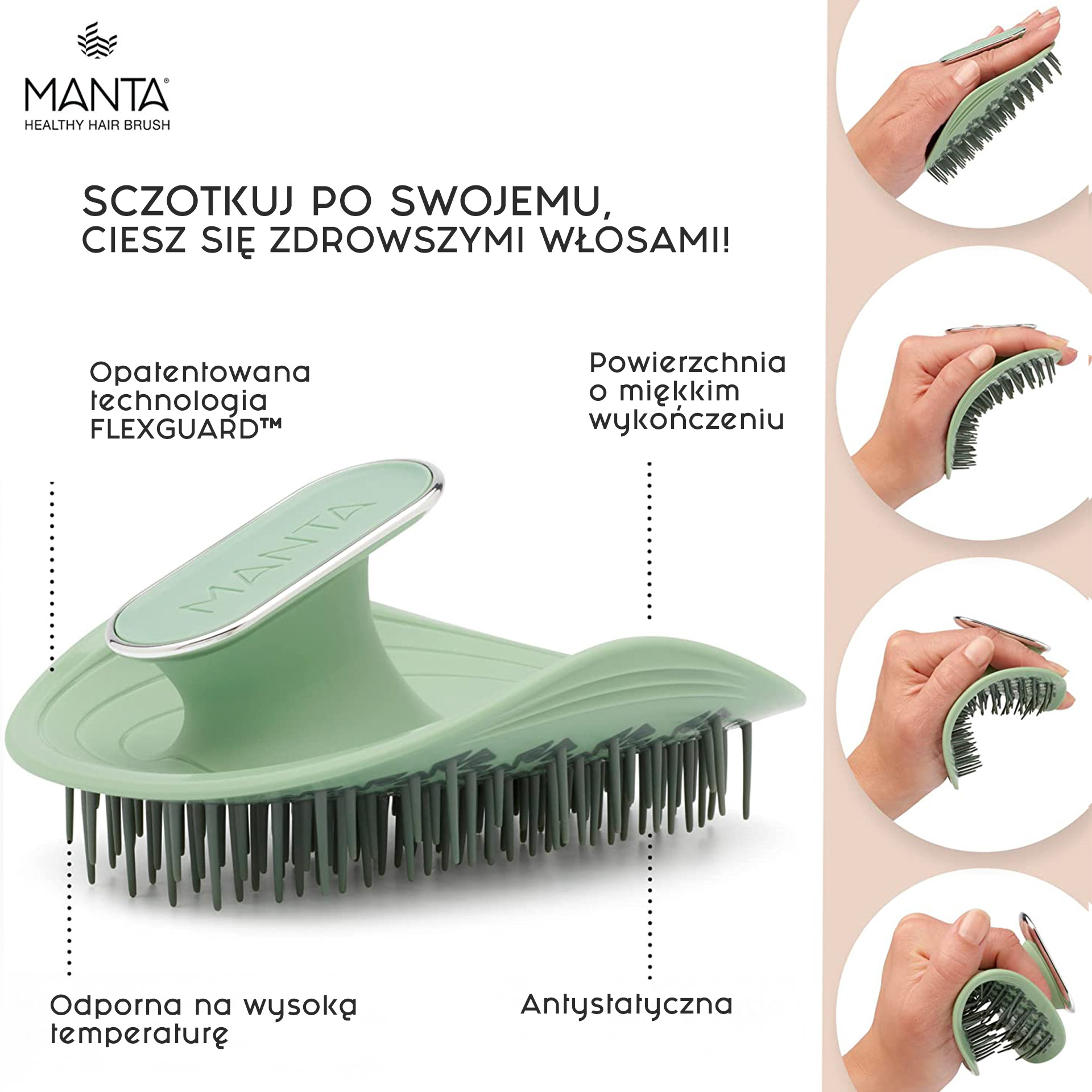 MANTA® płynnie sunie po włosach dzięki miękkiemu materiałowi, który zapewnia brak ostrych krawędzi mogących szarpać, ciągnąć lub niszczyć włosy. Szczotka dopasowuje się do kształtu dłoni i skóry głowy. Opatentowana technologia FLEXGUARD™ w podstawie umożliwia każdemu włosiu pełny ruch 360°, dzięki czemu nie powoduje łamania. Odporna na wysokie temperatury i antystatyczna.