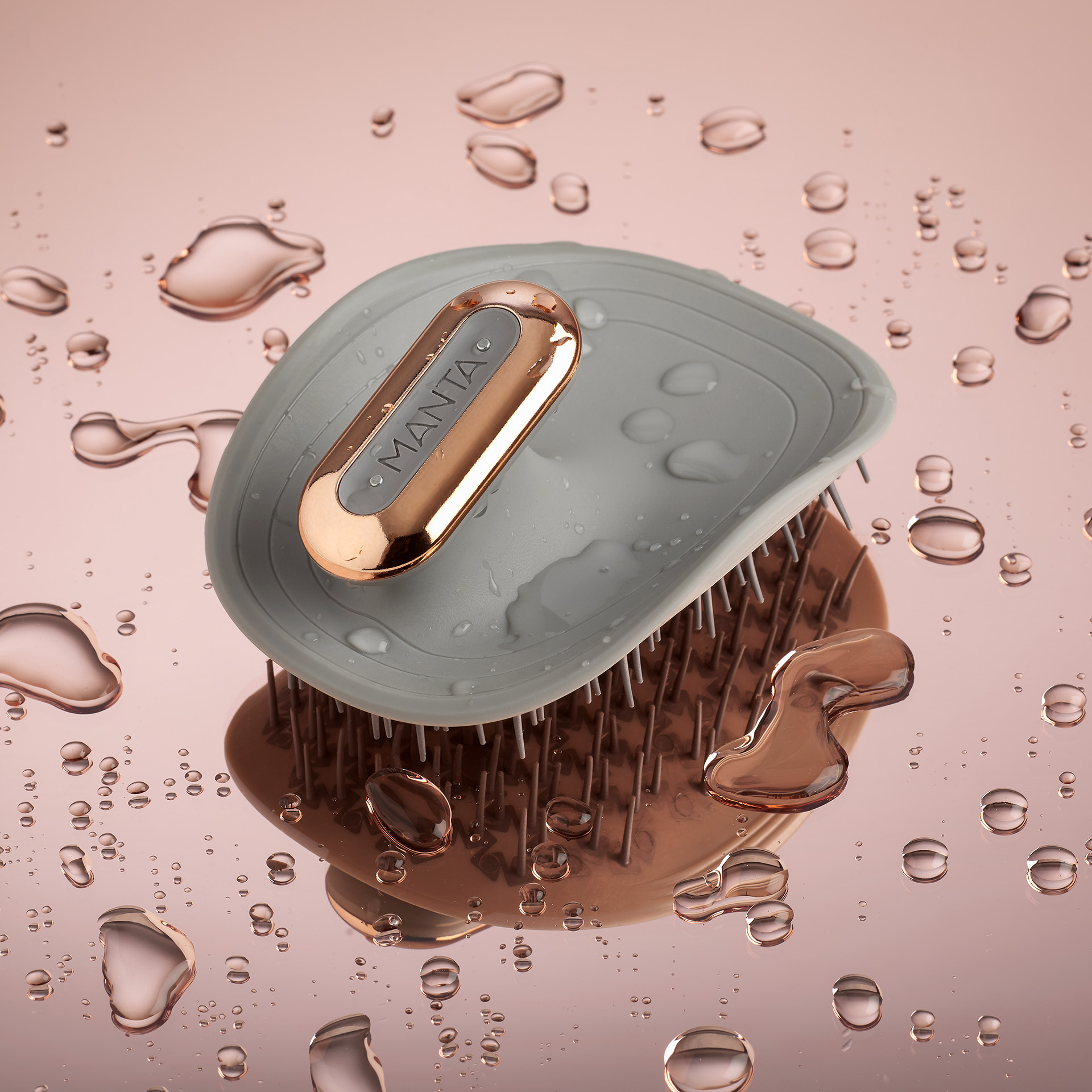 Innowacyjna szczotka MANTA® Pulse Grey Pink Gold z funkcją masażu delikatnie rozczesuje mokre i suche włosy, minimalizując łamanie. Elastyczne włosie i magnetyczne pulsacje stymulują skórę głowy, poprawiając krążenie i wspierając zdrowy wzrost włosów.