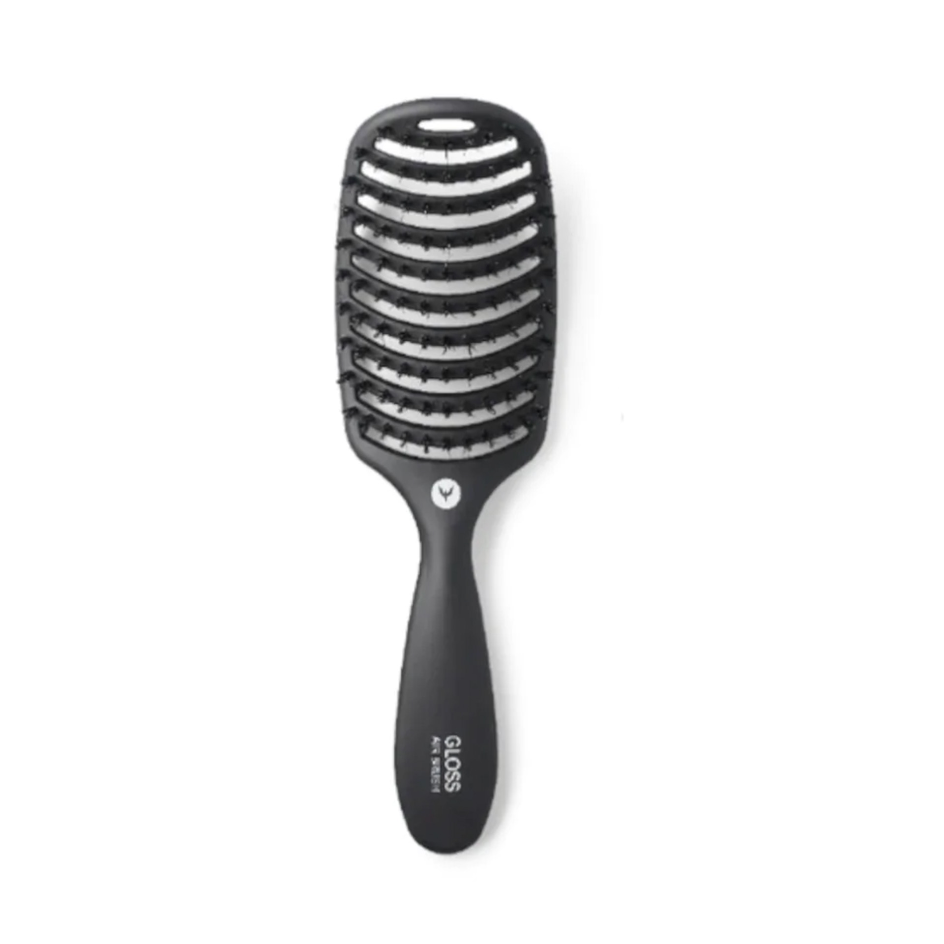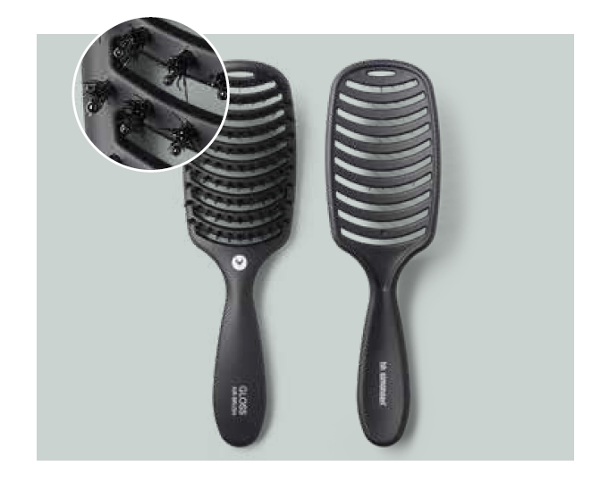 Wygodna w użyciu szczotka nabłyszczająca GLOSS AIR BRUSH łączy w sobie ultra elastyczne włosie Smartflex zakończone dużymi kuleczkami masującymi i naturalne włosie dzika, które stymulują skórę głowy. Włosy stają się mocniejsze i bardziej lśniące. „Przewiewna” konstrukcja skraca czas potrzebny na suszenie i rozczesywanie – dzięki swobodnemu przepływowi strumieni powietrza zapewnia niezwykle szybkie i skuteczne suszenie podczas jednoczesnego czesania włosów. Szczotka jest „dobrze wyważona”.